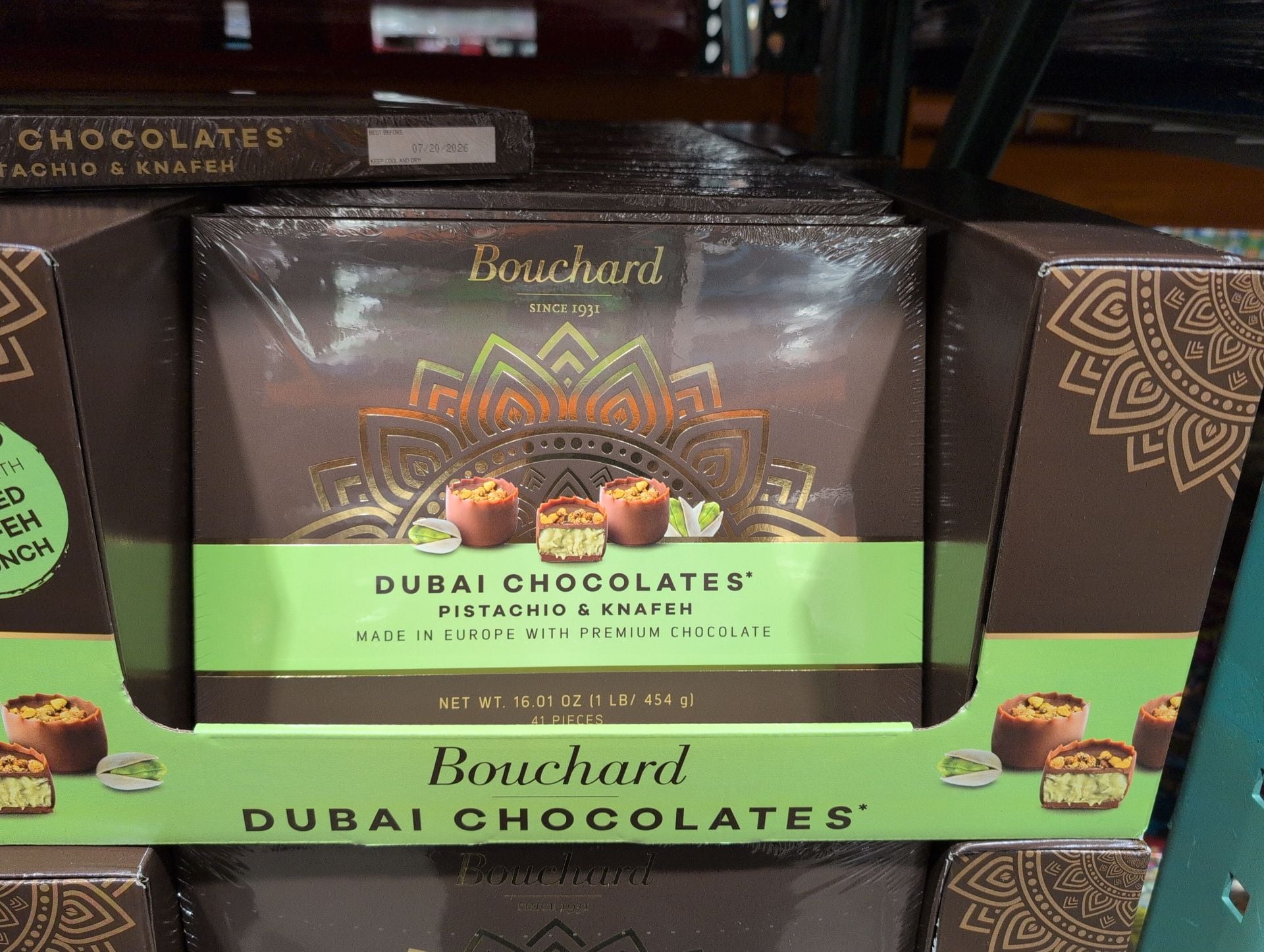 This is a 16-ounce package of Bouchard Dubai Chocolate, the viral sensation that’s been all over social media for its unique pistachio-filled layers. Dubai chocolate typically features a crispy, creamy filling wrapped in premium chocolate, and Bouchard is one of the brands riding this flavor wave that’s captivated chocolate enthusiasts worldwide.