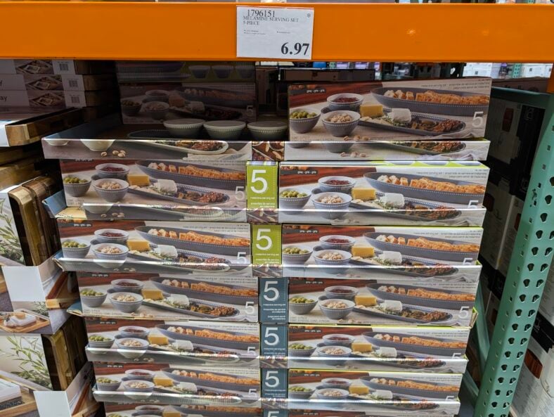 - Five-piece melamine serving set with multiple bowl and platter sizes
