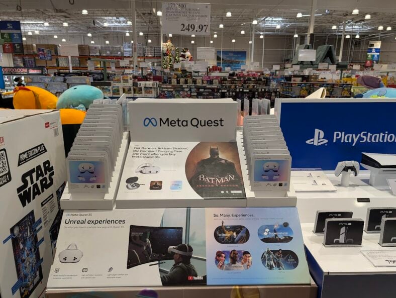 The Meta Quest 3S delivers virtual reality experiences with impressive visual clarity and performance. Batman: Arkham Shadow comes bundled alongside this headset for immediate gaming adventures. Mixed reality capabilities blend digital elements seamlessly with your real-world environment surroundings.