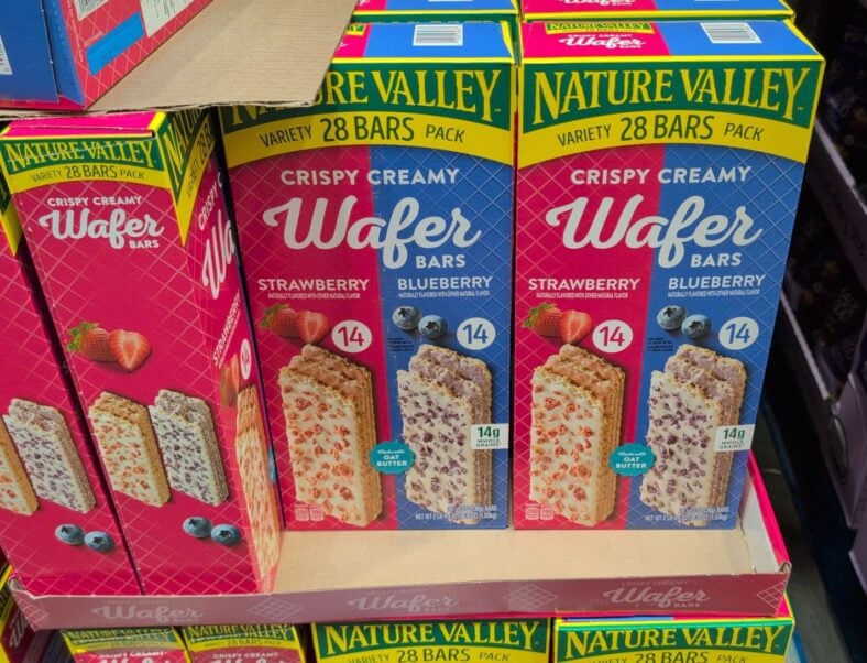 This variety pack gives you 28 individually wrapped wafer bars in in both strawberry and blueberry flavors. These are the crispy, multi-layered wafer cookies that hit that sweet spot between a granola bar and a traditional wafer cookie – lighter than a regular Nature Valley crunchy bar but still substantial enough to feel like a real snack with 14g of whole grains.