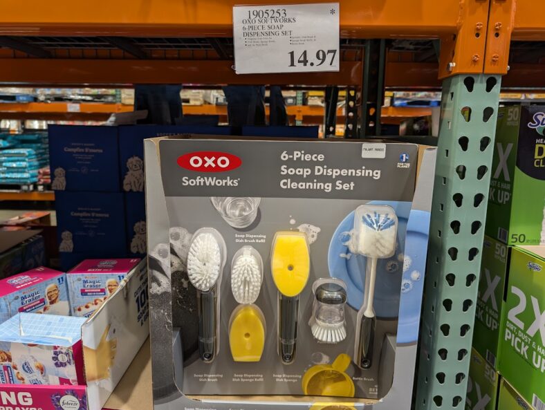 The OXO Softworks soap dispensing set transforms kitchen cleaning into an efficient operation. These three specialized brushes tackle different cleaning challenges with their built-in soap dispensers. No more fumbling with separate soap bottles while scrubbing stubborn food residue away.